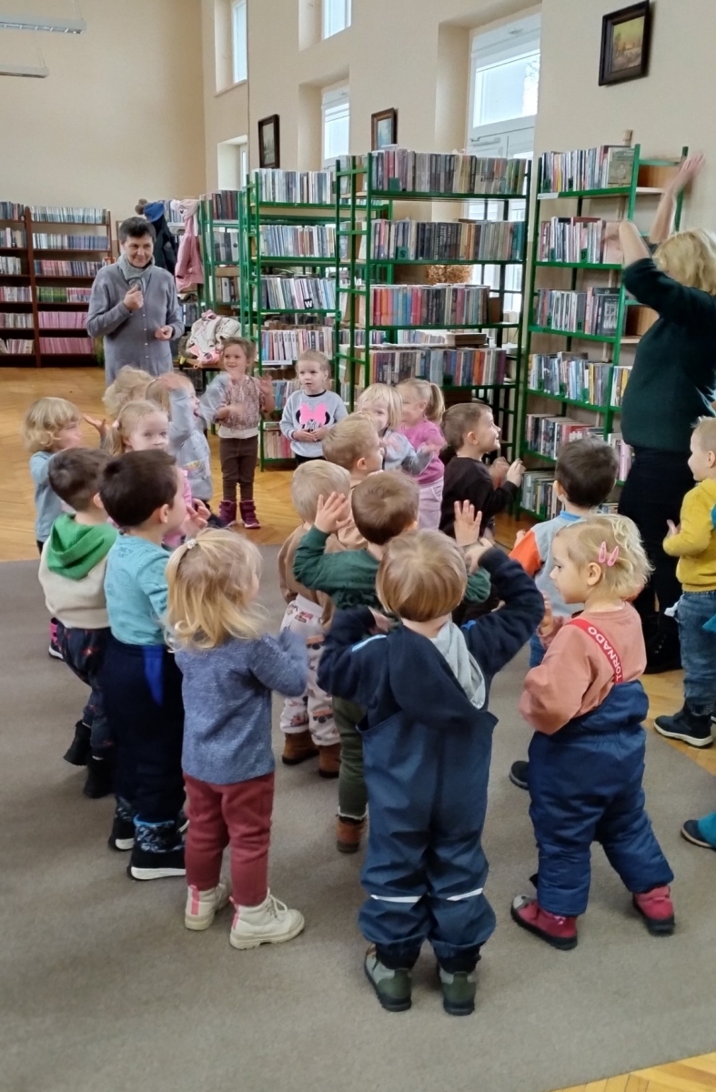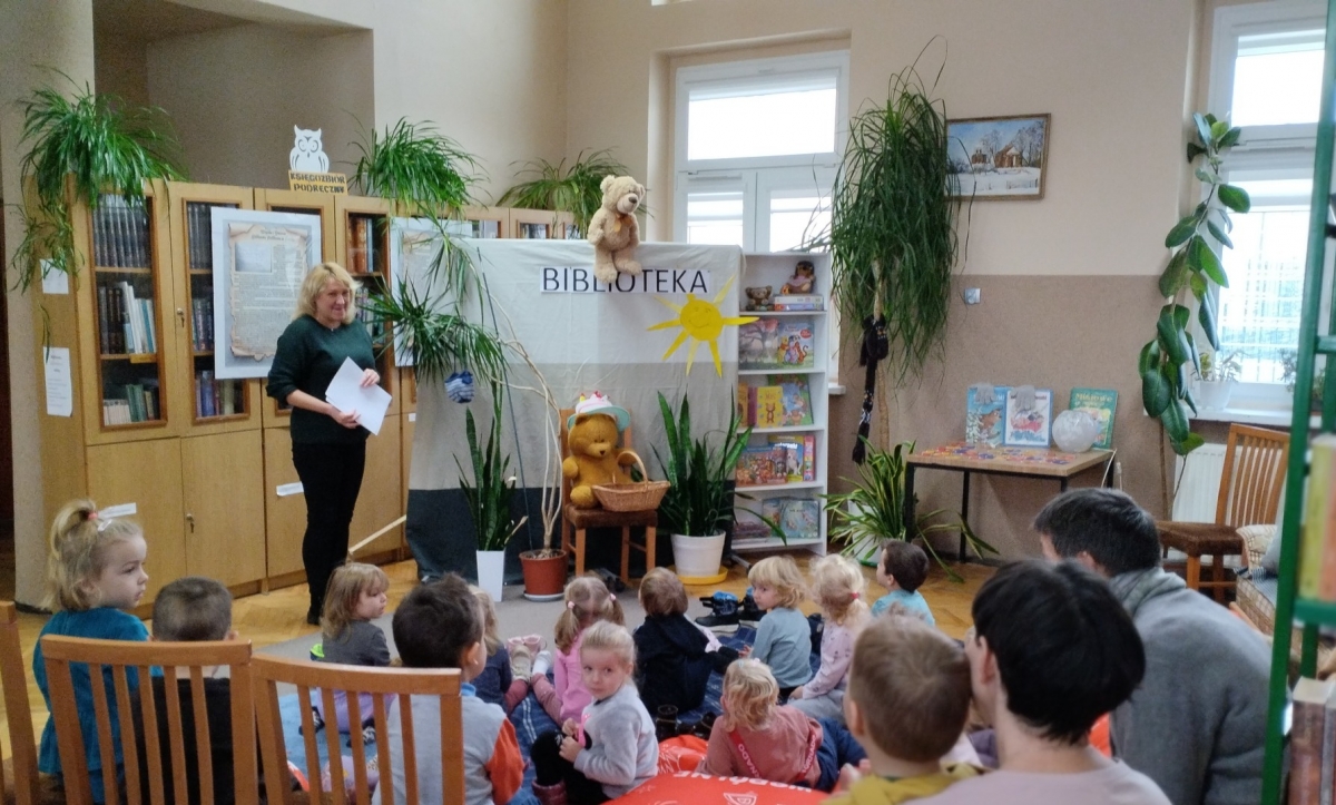 W dniu dzisiejszym wspólnie z grupą dzieci z Publicznego Przedszkola w Szadku świętowalismy Dzień Pluszowego Misia. Maluszki wysłuchały krótkiej historii tego wyjątkowego święta, a następnie obejrzały teatrzyk pt. „Miś w bibliotece”. Przedszkolaki wręczyły naszemu misiowi kolorowe serduszka, zaśpiewały mu gromkie „Sto lat”, a potem bawiły się w misiową wyliczankę. W rytmie wesołych, misiowych piosenek ruszyły także w „długi pociąg”, zwiedzając całą bibliotekę.