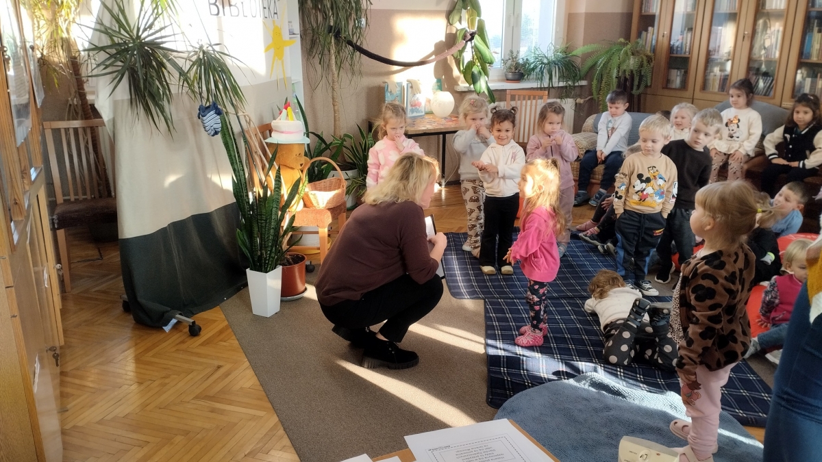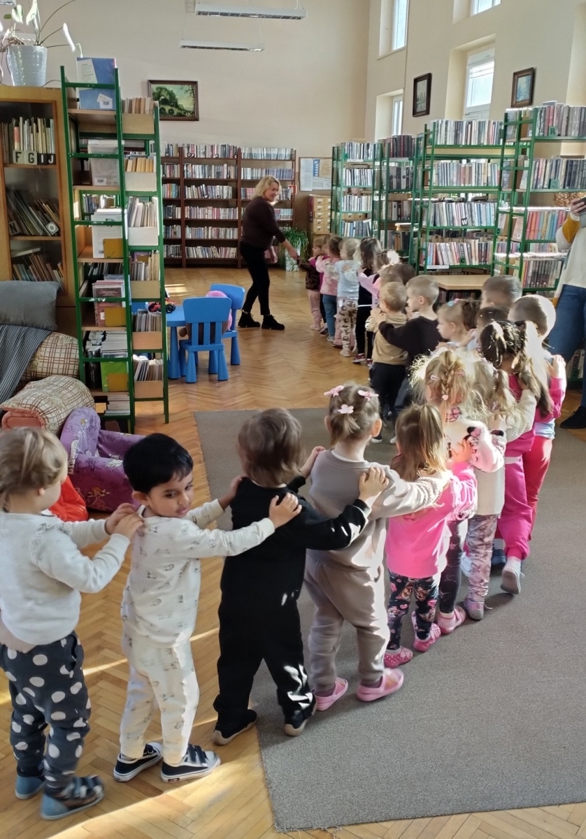 Przedszkolaki zaśpiewały misiowi „Sto lat”, zaprezentowały również wesołe piosenki i wręczyły mu kolorowe serduszka. Wspólnie bawiliśmy się w zabawy ruchowe, a następnie długim „pociągiem” dzieci zwiedzały biblioteczny księgozbiór.