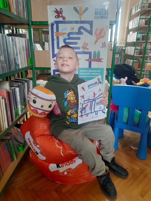 Z dumą prezentujemy Aleksandra, który ukończył wyzwania Małej Książki – Wielkiego Człowieka, zbierając komplet naklejek na swojej karcie. Gratulujemy i życzymy mnóstwa fascynujących przygód na dalszych literackich wyprawach. Wszystkim przypominamy, że wyprawki dla najmłodszych czekają w naszej bibliotece. Szczegóły akcji na stronie: http: //wielki-czlowiek. pl/przedszkolaki/