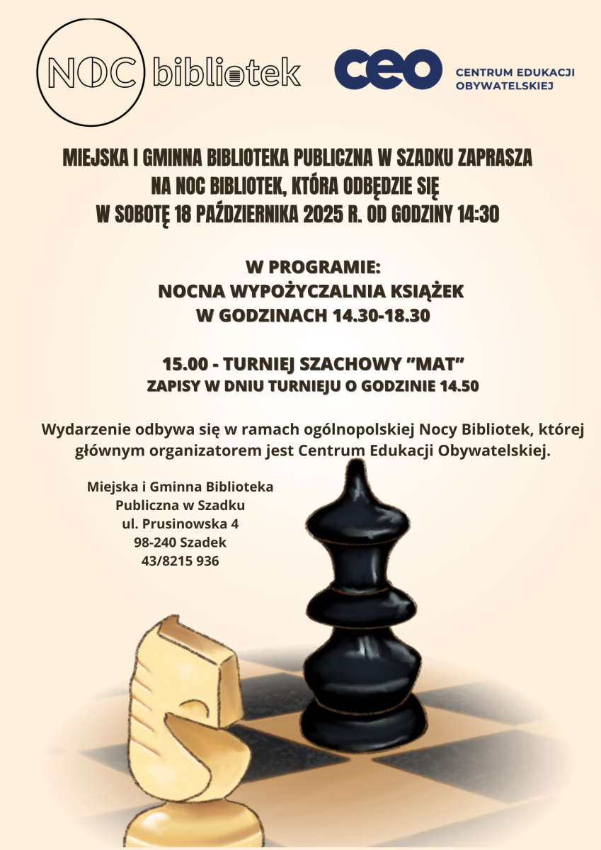 18 października zapraszamy na Turniej Szachowy "MAT" w ramach Nocy Bibliotek. Więcej informacji na plakacie i w regulaminie turnieju.